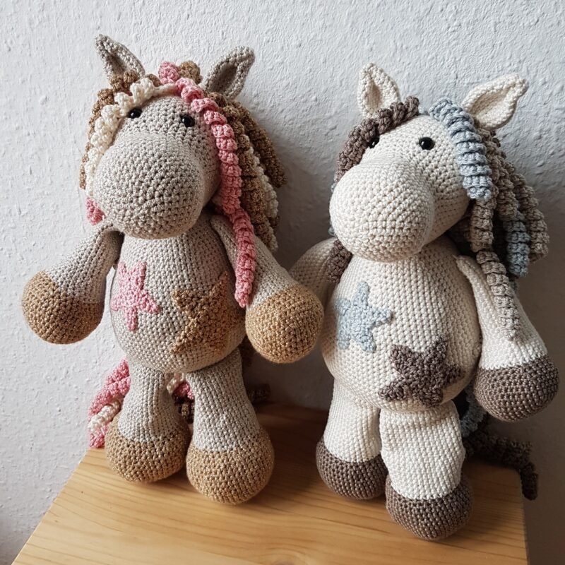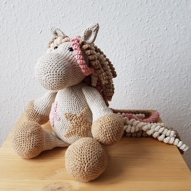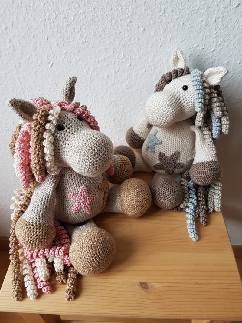Wenn ihr dickeres Garn verwendet, wird das Pony natรผrlich noch grรถรer. bitte nur darauf achten, dass ihr fรผr alle Teile die gleiche Garn-Dicke verwendet, damit alles zusammenpasst.