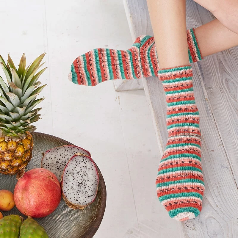 Frisches Obst, köstliche Smoothies, erfrischende Cocktails – dieses Garn feiert die schönen Seiten des Lebens. Damit dein Sommer niemals endet … Süße Früchte für deine Füße – von Orange über Wassermelone bis hin zur Drachenfrucht findest du bestimmt etwas nach deinem Geschmack!