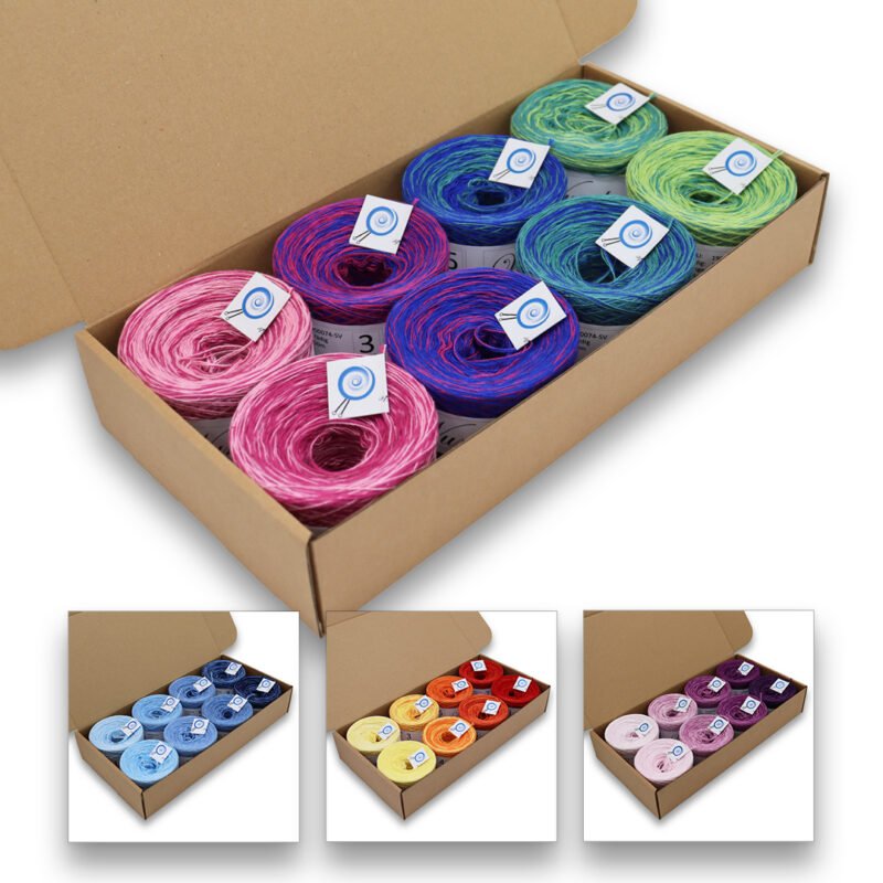 Sie erhalten hier eine Kiste aus stabilem Karton mit 8 Bobbeln, 3-fädig, mit jeweils 250 m Lauflänge.
