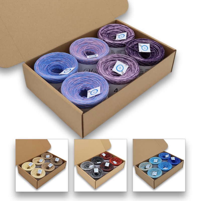 Sie erhalten hier eine Kiste aus stabilem Karton mit 6 Bobbeln, 4-fädig, mit jeweils 250 m Lauflänge.